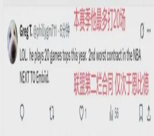 球迷说他俩是数一数二的烂合同,也在情理之中。恩比德本赛季一直有出场时间限制,而且不打背靠背的比赛。结果恩比德刚打了6场比赛,因为右膝盖酸痛再次休战。他已经连续缺席了2场比赛,目前是每日观察的状态,归期未定。