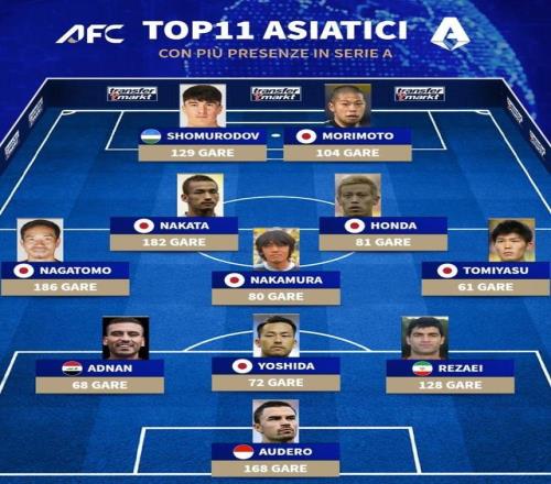 12月13日,德国转会市场列出了意甲联赛历史出场次数最多的亚洲球员11人阵容,其中多达7名日本球员:森本贵幸、中田英寿、本田圭佑、中村俊辅、长友佑都、吉田麻也、富安健洋。