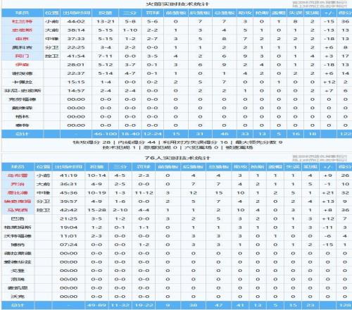 杜兰特36分7板3助、阿门17分6板9助3断、谢泼德14分1板4助2断、伊森13分9板2助4断、申京13分8板7助2断2帽、史密斯13分4板5助、奥科吉8分2板2助、芬尼-史密斯6分2板1助